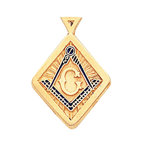 Polished solid 14k yellow gold masonic pendant features the G, set square and compass in blue enamel. Item size: 7/8 inch tall and 3/4 inch wide. This item is the size of a nickel. Fits up to a 4mm wide chain. Pendant thickness: 1mm. Approximate weight: 3.0 grams. Made in USA.