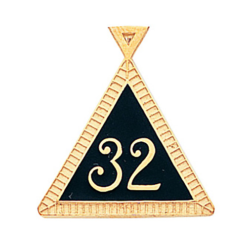 This triangular Scottish Rite 32nd degree pendant is made of polished 14kt yellow gold. Black enamel. Item measures 7/8 inch tall and 1 inch wide. Made in the USA.
