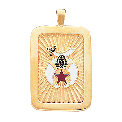This rectangular Shriner pendant features an enameled scimitar and crescent logo and is made of solid polished 10k yellow gold. Item size: 1 1/4 inch tall and 7/8 inch wide. Chain sold separately. Made in USA.