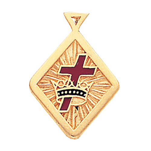 Knights templar pendant is made of polished 14k yellow gold. Red enamel cross with crown. Item measures 3/4 inch tall and 11/16 inch wide. Fits up to a 3mm wide chain. Chain sold separately. Made in USA.