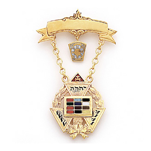 Polished 10k yellow gold. Past Master Masonic jewel measures 2 5/8 inch tall and 1 1/2 inch wide. Suitable for framing.