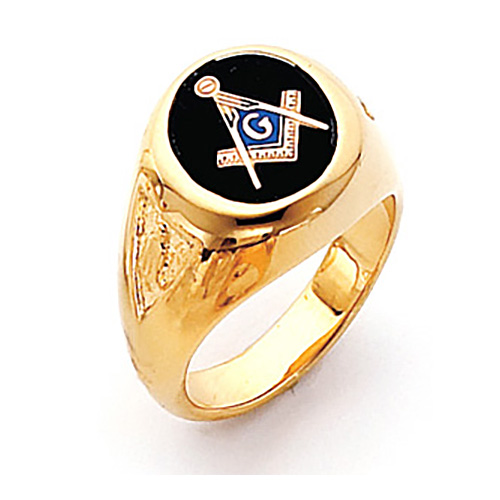 Solid back, vermeil [yellow gold plated] ring with red, blue or black round onyx stone. Blue Lodge logo, full color.