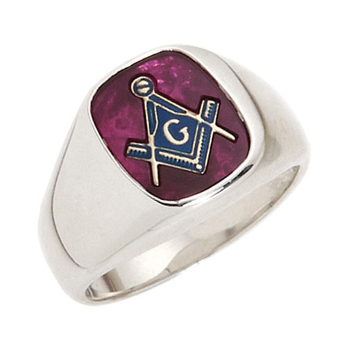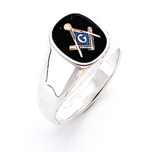 Solid back, sterling silver masonic ring offers your choice of a red, blue or black oblong onyx stone. Stone size: 12mm x 10mm. G, square and compasses masonic logo with blue enamel. This masonic ring has smooth polished sides. Standard fit. Made in USA.