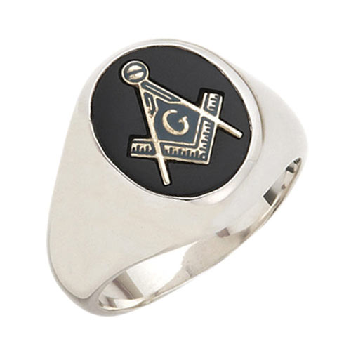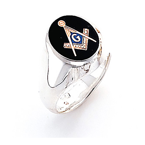 Solid back, sterling silver masonic ring with red, blue or black oval onyx stone. Anti-tarnish sterlite. Blue Lodge logo, full color. Made in the USA.