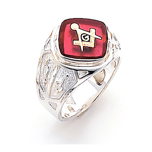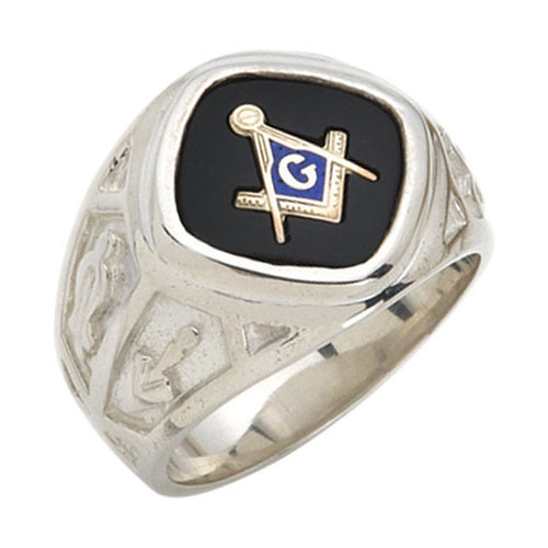 Solid back, sterling silver masonic ring offers your choice of a red, blue or black square shaped onyx stone. Blue Lodge logo, full color. Plumb bob and trowel combo emblems. Made in the USA. Anti-tarnish sterlite.