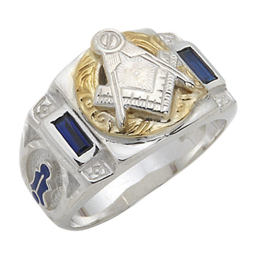 Solid back, sterling silver masonic ring has two simulated blue sapphire baguette accent stones. Anti-tarnish sterlite. Blue lodge logo with oversized G. Plumb bob and trowel side emblems. Standard fit. Made in the USA.
