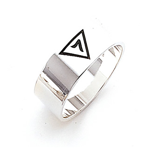 This 8mm Scottish Rite 14th degree ring is made of polished sterling silver. Anti-tarnish sterlite. Scottish Rite logo in black enamel. Smooth sides. Interior engraving: VIRTUS JUNXIT MORS NON SEPARABIT. Latin: Virtue has joined together; death will not separate.