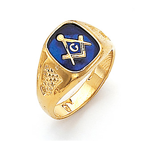 Solid back, gold-plated sterling silver masonic ring with red, blue or black oval 12mm x 10mm stone. Cross-stitch textured sides. Anti-tarnish sterlite. Blue Lodge logo, full color. Handcrafted in the USA.