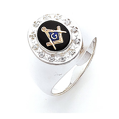 Solid back, sterling silver ring with red, blue or black oval shaped onyx stone. Cubic zirconia accents surround the center stone on the bezel. Anti-tarnish sterlite. Blue Lodge logo, full color.