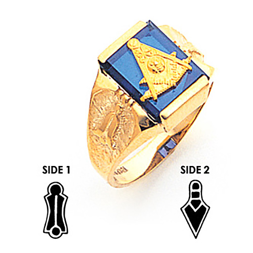 This tapered past master mason ring is made of polished 14kt yellow gold and offers your choice of a black, blue or red rectangular stone. Past Master insignia. Plumb bob and trowel side emblems. Solid or open back. Made in the USA.