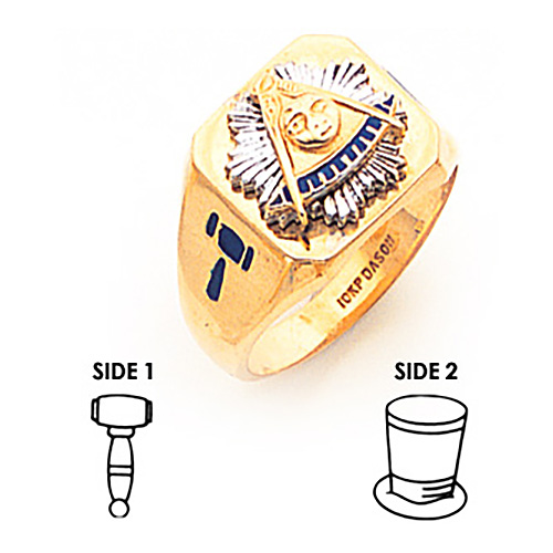 14k yellow gold past master mason ring has blue enamel gavel and top hat side emblems. 10k white gold Past Master insignia. Solid back and standard fit. Smooth polished finish. Top dimensions: 13mm x 13mm. Size 10 ring weighs approximately 12 grams. Standard fit. Made in USA.