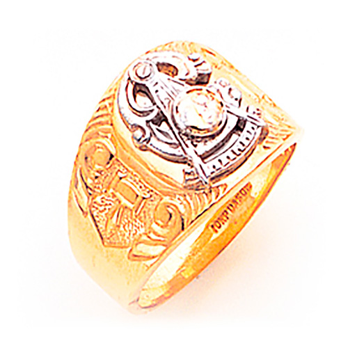 This large past master mason ring has a solid back and is made of 10k yellow gold. 10k white gold Past Master insignia. Gavel and top hat side emblems. Item top width: 21mm. Size 12 ring weighs 10.4 grams. Made in the USA.