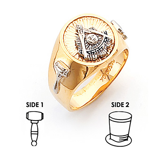 This solid 10k yellow and white gold Harvey & Otis past master mason ring has a round sunburst style top. 10kt white gold Past Master insignia sits in center. Gavel and top hat side emblems. Solid back. Standard fit. Made in the USA.