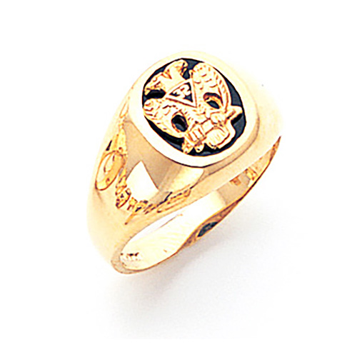 10k yellow gold Scottish Rite ring has a double-headed eagle design on black enamel. Open back. Round signet style top and smooth plain shank. Standard fit. Made in the USA.