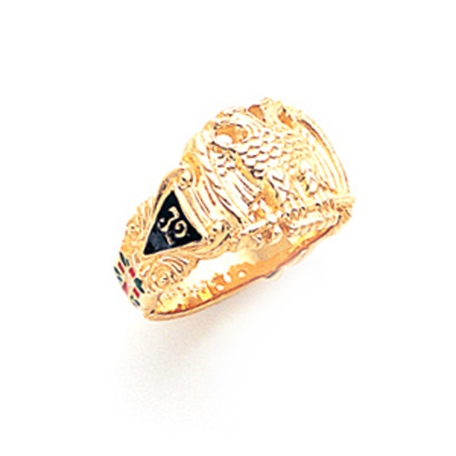 Solid back, polished 10k yellow gold Scottish Rite ring has a double-headed eagle on top. Finely detailed ring features four enamel side emblems. Left side has 32nd degree and rose croix emblems. Right side has yod symbol and Prince of Jerusalem emblems. Standard fit. Made in USA.
