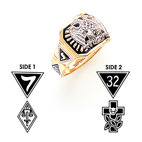 Solid back, polished 14k yellow gold Scottish Rite ring has an octagonal top. Finely detailed ring features four enamel side emblems. Also available in white gold by special order. Standard fit. Made in USA.