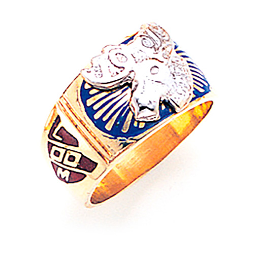 Polished 10k yellow and white gold ring. Hidden moose insignia in 10k white gold sits atop blue enamel sunburst oval top. This ring features side emblems LOOM and PAP. LOOM is Loyal Order of the Moose. PAP is an acronym for Purity, Aid and Progress. The Loyal Order of Moose is a fraternal and service organization founded in 1888, with nearly 1 million men in roughly 1,800 Lodges, in all 50 states and four Canadian provinces, plus Great Britain and Bermuda.