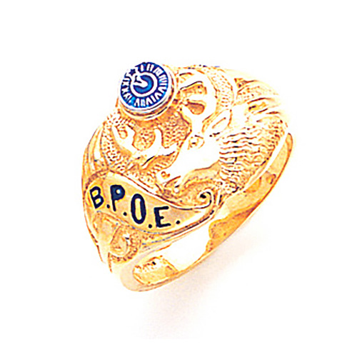 This goldline Elk ring has a small blue enamel 11 o'clock emblem on top and is made of solid polished 14k yellow gold. This ring is 9/16 inch at the widest top measurement. Solid back. Finely detailed ring features yellow gold elk on signet style top, flanked with BPOE on the left. BPOE is an acroynm for The Benevolent & Protective Order of Elks. Made in USA.