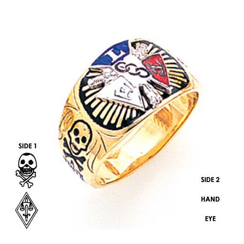 Odd fellow ring has a solid back, and is made of polished 14k yellow gold. Skull and crossbones, scales of justice, hand and eye side emblems. FLT tri-tone enamel seal represents the central tenets of the Odd Fellows: Friendship, Love, and Truth.