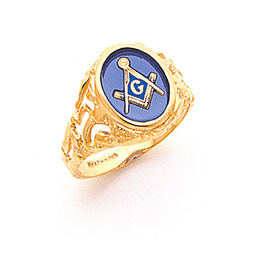 Solid back, polished 10k yellow gold masonic ring has a tapered shank and cut out sides. Masonic compass and set square symbol. Choose red, blue or onyx oval stone. Size 10 approximate weight: 3.8 grams. Also available in white gold by special order. Standard fit. Made in USA.