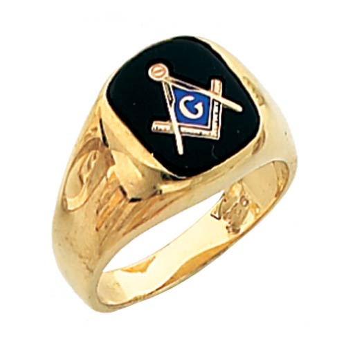 This 10k yellow gold masonic ring has smooth tapered sides without emblems. Choose red, blue or onyx oblong stone. The top of the ring always has a G, square and compasses symbol. Stone size: 11 x 9mm. Handcrafted in the USA.