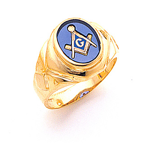 Choose a red, blue or black onyx oval stone for this masonic ring made of 14k yellow gold. Notched and tapered sides. G, square and compasses symbol on top. Also available in white gold by special order. Made in USA.