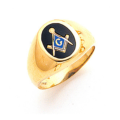 This slender 10k yellow gold masonic ring offers your choice of a black, blue or red oval stone. Oval stone is 12mm x 10mm. Tapered blank sides. Available in open or solid back. Also available in white gold by special order. Standard fit. Made in USA.