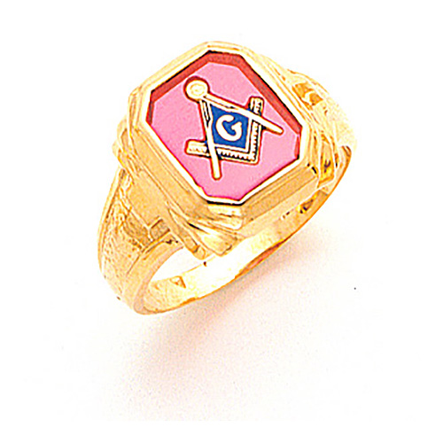 Solid or open back, polished 10k yellow gold masonic ring has an octagonal stone. Masonic compass and set square symbol. Stone size: 11mm x 10mm. Choose red, blue or onyx stone. Tapered blank sides. Also available in white gold by special order. Made in the USA.