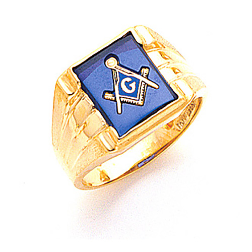 14kk yellow gold masonic ring has tapered, grooved blank sides. Masonic compass and set square symbol. Choose red, blue or onyx rectangular stone. Stone dimensions: 12 x 10mm. Solid or open back. Polished finish. Standard fit. Made in USA.