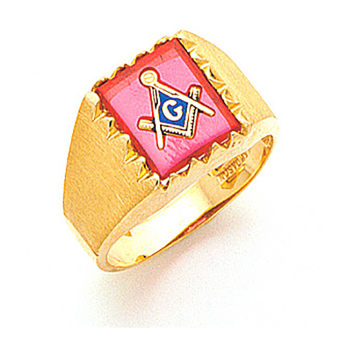 Open back 14k yellow gold masonic ring has a rectangular stone and sawtooth edges. Masonic compass and set square symbol. Wide tapered blank sides. Choose red, blue or onyx rectangular stone. Standard fit. Made in USA. Also available in white gold by special order.