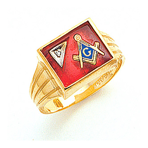This 14k yellow gold diamond masonic ring features your choice of red, blue or onyx rectangular stone. 1 x .05 PT round full-cut diamond accent in triangular bezel. Solid back ring has a masonic square and compasses symbol.Tapered and grooved shank. Also available in white gold by special order. Made in USA.