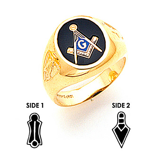 This jumbo 14kt yellow gold masonic ring offers your choice of a red, blue or onyx oval stone. The stone is 14mm x 12mm. Solid or open back. Masonic compass and set square symbol. Tapered sides feature the plumb bob on the left and trowel on the right. Also available in white gold by special order. Standard fit. Made in the USA.