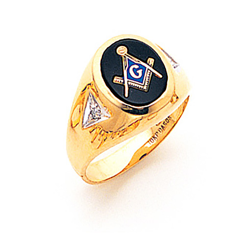 Smooth back, polished 14kt yellow gold masonic ring has two 2 x .01 CT full-cut round diamond accents. Choose red, blue or onyx oval stone. Tapered shank, cut out sides. Size 10 weighs approximately 9.0 grams. Also available in white gold by special order. Made in the USA.