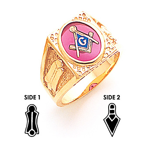 Choose red, blue or onyx oval stone. Partial solid back, polished 14k yellow gold ring with Masonic compass and set square symbol. Wide tapered shank. Also available in white gold by special order.