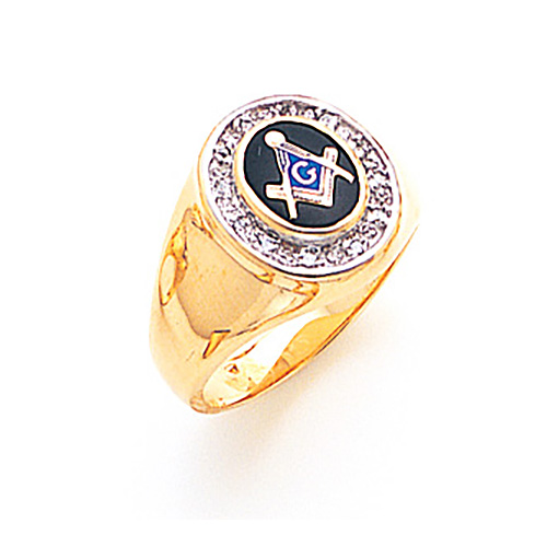 Solid 10k yellow gold masonic ring has a bezel set with genuine round diamonds. 12 x .01 CT full-cut round diamond accents. Choose red, blue or onyx 10mm x 8mm oval stone. Tapered shank. Also available in white gold by special order. Solid back. Standard fit. Made in the USA.