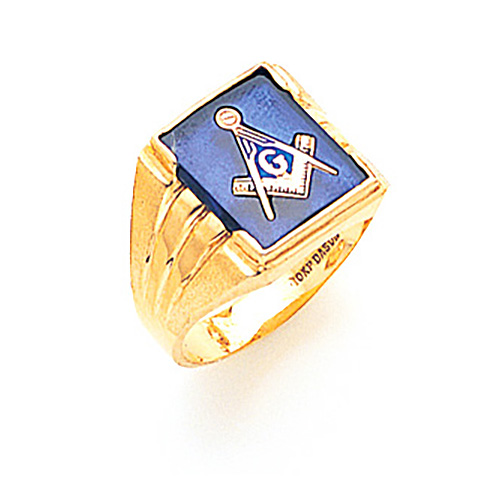 Solid back, polished 10k yellow gold masonic ring has tapered grooved sides. Choose red, blue or onyx rectangular stone encrusted with the G, square and compasses symbol. Stone size: 14mm x 12mm. Standard fit. Made in USA. Also available in white gold by special order.