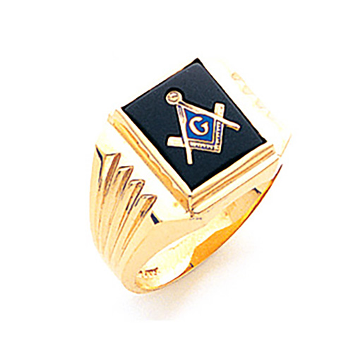 Solid back, polished 14kt yellow ring with Masonic compass and set square symbol. Wide grooved sides. Choose red, blue or onyx rectangular 12mm x 10mm stone. Also available in white gold by special order. Made in the USA.