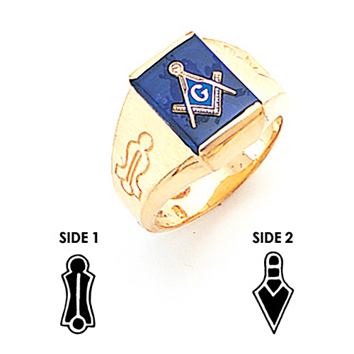 14k yellow gold masonic ring has etched side emblems. Choose a red, blue or onyx rectangular stone encrusted with the G, square and compasses symbol. Solid back. Wide shank with etched plumb bob and trowel side emblems. Standard fit. Made in USA. Also available in white gold by special order.