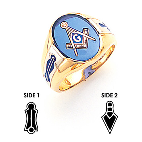 Open back, polished 10k yellow gold ring with Masonic compass and set square symbol. 10k white gold and blue enamel side emblems. Choose red, blue or onyx oval stone. Stone size: 14mm x 12mm. Standard fit. Made in USA.