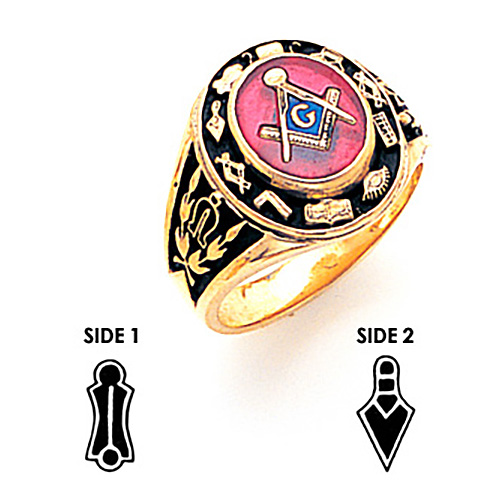 Choose a red, blue or black onyx oval stone for this 10k yellow gold cipher masonic ring. G, square and compasses symbol on top. Solid back. Masonic cipher bezel, black enamel. Stone size: 12mm x 10mm. Ring is 20mm at its widest point. Also available in 10kt white gold by special order. Handcrafted in the USA.