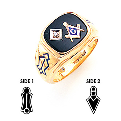 Choose red, blue or onyx oblong 13x11mm stone. Solid back, polished 14kt yellow gold ring with Masonic compass and set square symbol. 1 x .01 CT full-cut round diamond accents. Tapered shank, dark blue enamel side emblems. Also available in white gold by special order.