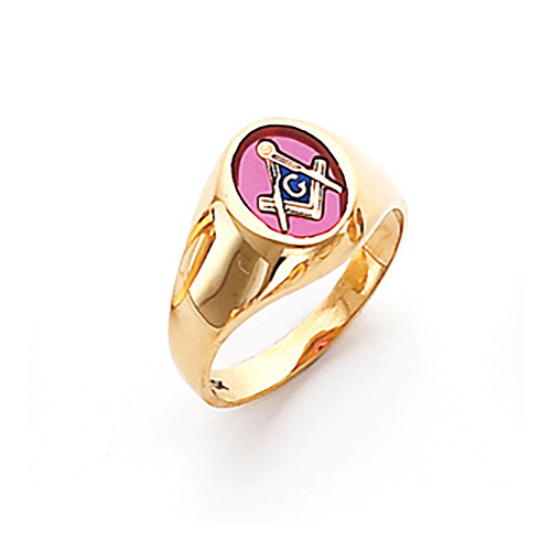 Choose red, blue or onyx 10x8mm oval stone for this small masonic ring. Open back, polished 10k yellow gold ring with Masonic compass and set square symbol. Tapered shank, smooth blank sides. Also available in white gold by special order. Standard fit. Made in USA.