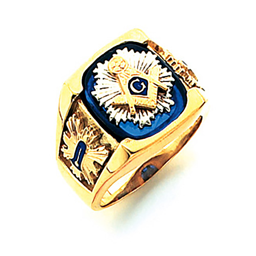 Choose red, blue or onyx 16x14mm oblong stone. Open back, polished 14k yellow gold ring with Masonic compass and set square symbol. Wide shank with blue enamel side emblems. Size 10 ring weighs approximately 14 grams. Made in USA.