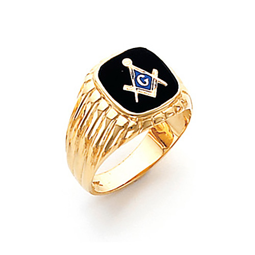 14kt yellow gold Harvey & Otis masonic ring has a grooved texture. Choose red, blue or onyx 10mm x 10mm oblong stone. Open or solid back. Ribbed shank. Also available in white gold by special order. Made in the USA.