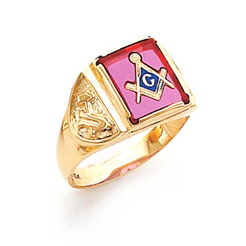 Harvey & Otis masonic ring offers your choice of a red, blue or onyx 12x10mm rectangular stone. Solid polished 14k yellow gold ring with Masonic compass and set square symbol. Wide tapered shank with plumb bob and trowel side emblems. Also available in white gold by special order. Standard fit. Made in USA.