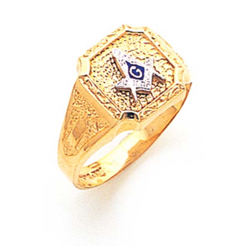 Open back, polished 14k yellow gold masonic ring has a square pebble grain top. Small 14k white gold masonic compass and set square symbol. Ring top width: 1/2in. Tapered shank with plumb bob and towel side emblems. Standard fit. Made in USA.