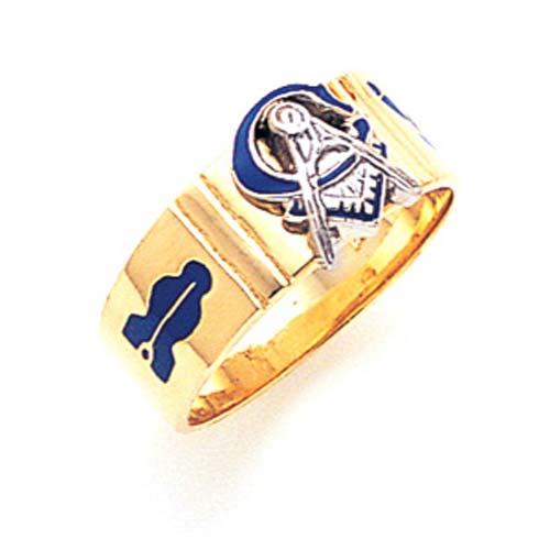 Solid back, polished 14k yellow gold masonic wedding band has a 14k white gold Masonic compass and set square symbol. Ring width: 8.5mm. Enlarged G. Tapered shank with blue enamel side emblems. Made in the USA.