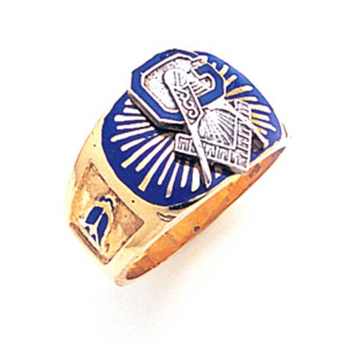 Solid back, polished 10k yellow gold ring. 10k white gold Masonic compass and set square symbol. Blue enamel sunburst top. Tapered shank with blue enamel plumb bob and trowel side emblems. Also available in white gold by special order. Made in USA.