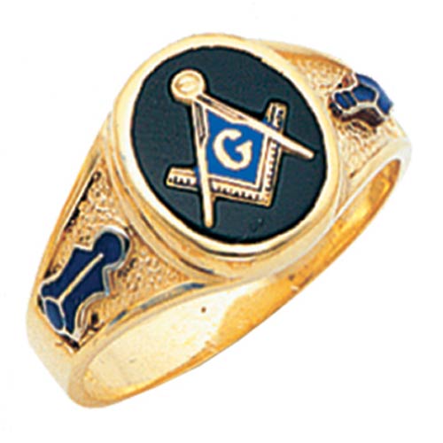 Choose red, blue or onyx oval stone for this designer masonic ring. Solid back, polished 10kt yellow gold. Masonic compass and set square symbol. Tapered pebble grain shank with side emblems. Dimensions: 12x10mm. Approximate weight: 4.9 grams. Made in USA.