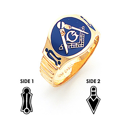 Solid back, polished 10k yellow gold masonic ring has a tapered ribbed shank and blue enamel. Ring top width: 14mm. Plumb bob and trowel blue enamel side emblems. Made in USA.